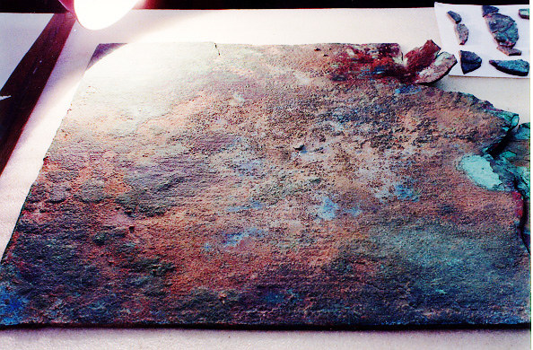 El Gran Bronce de Botorrita contiene un texto en lengua celtibérica, escrito en semialfabeto ibérico, si bien no sería de extrañar la presencia de alguna influencia lingüÍstica del ibero, dada la situación culturalmente fronteriza de Contrebia Belaisca. Por lo que respecta a su cronología, lo único que podemos decir, mientras no avance el trabajo arqueológico en la zona de hallazgo es que, probablemente, debe ser coeténeo del anterior bronce celtibérico y que, por los materiales aparecidos en el inmediato entorno (los glandes de honda citados), su abandono debe coincidir con algún acontecimiento bélico. A continuación puede verse uno de los triángulos de sujeción, con restos de clavos, y signos visibles de la zona superior derecha del bronce. Todo ello sin restaurar.